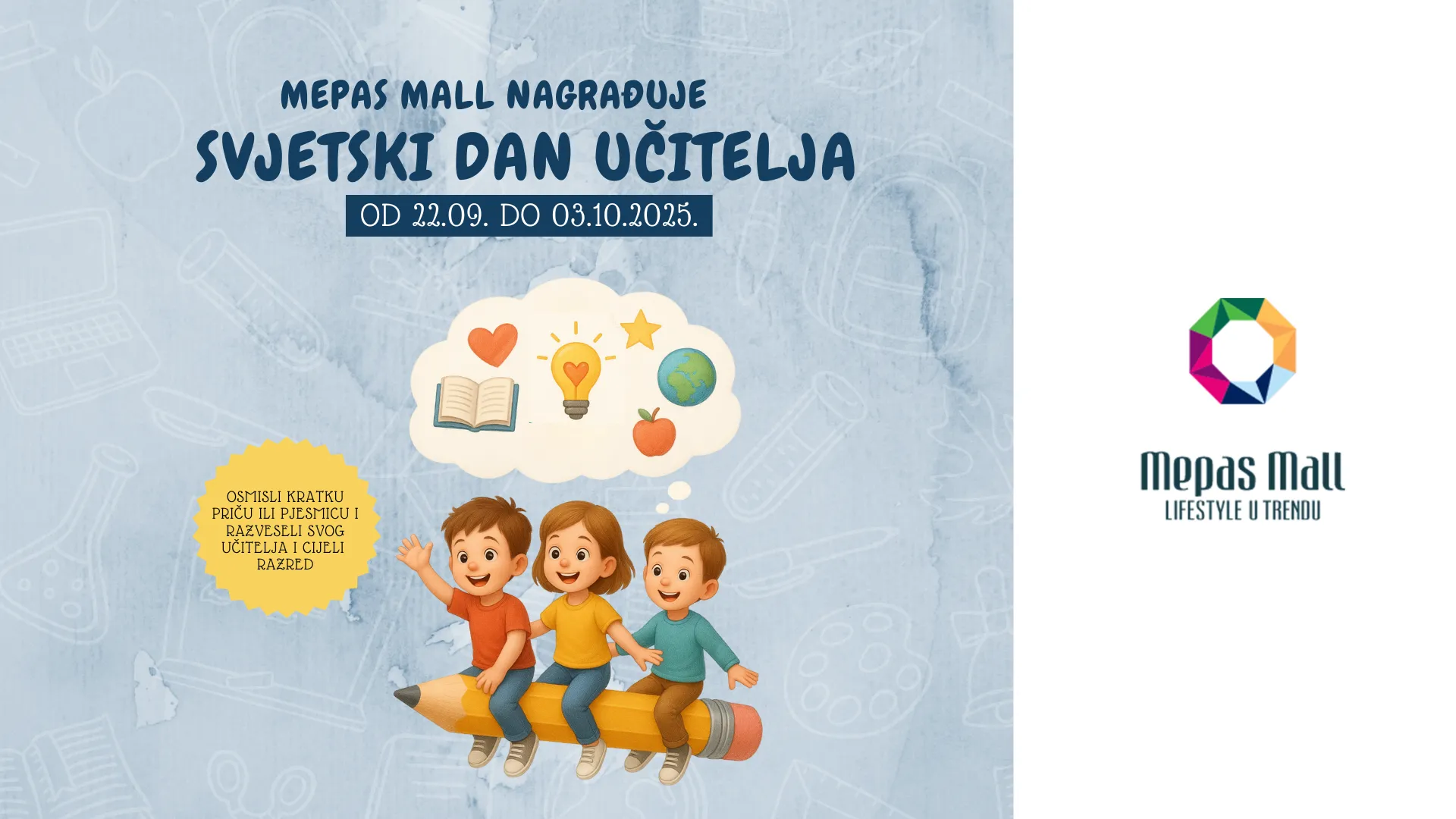 Svjetski dan učitelja obilježava se 5. listopada, prilika je da zahvalimo onima koji su utkali dio sebe u naš rast i odrastanje. Zato pozivamo djecu u razdoblju od 22. rujna do 4. listopada, napišite kratku priču ili pjesmu o svom učitelju ili učiteljici, zašto su vam posebni, što ih čini drugačijima i zašto zaslužuju da baš njihovo ime zasja na ovom danu.